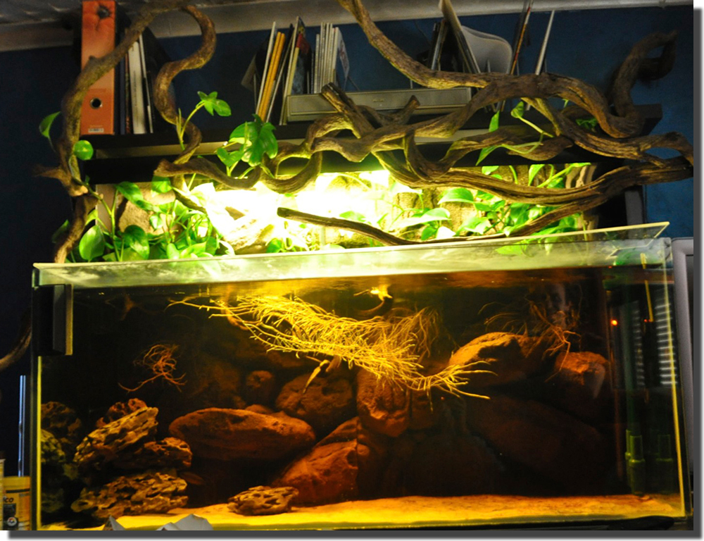 Le foto spiegano più di mille parole: sfondo interno ricavato da più pezzi di Juwel. I valori non hanno una rilevanza particolare. L’acqua è colorata da un’ingente quantità di tannini, mentre la parte superiore è stata preferita per il gioco di intrecci, ottenuto incrociando liane, e l’illuminazione è posta sopra il gioco delle liane, a quasi un metro dal plexiglass che è sulla superficie dell’acquario, in maniera tale che l’evaporazione venga contenuta, e il minimo va direttamente alle piante che si sviluppano tra le liane.