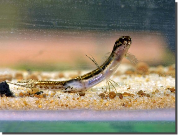Lepidogalaxias salamandroides, in piedi come fosse eretto sul busto