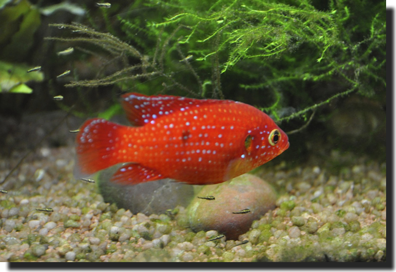 Le fasi riproduttive sono di indubbio interesse: le fasi embrionali visibili dagli attenti osservatori: ciclidi rossi, la femmina depone su substrati lisci, il maschio si occuperà sempre di difendere la prole. Si stanno studiando i segnali distintivi che la coppia impartisce allo sciame di avannotti per dar loro le indicazioni sul movimento.